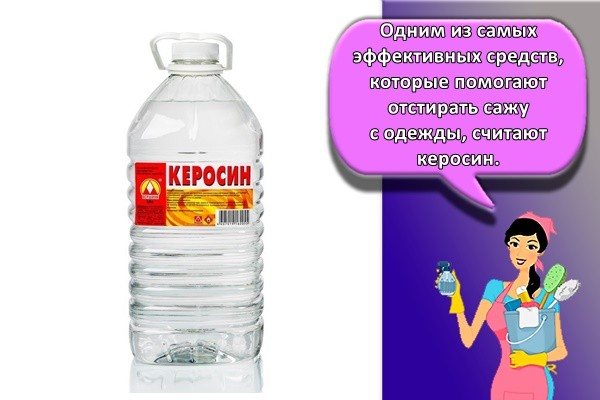 Самый простой способ отстирать копоть – это керосин. Но он не подходит для капризных тканей. Чтобы очистить пятно необходимо в керосине промочить ватный диск и им стереть загрязнение движениями от краев к центру. Когда пятно будет пропитано керосином, вещь оставляют на 15 минут, а потом застирывают со стиральным мылом.