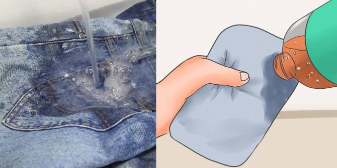 - Применяя агрессивное средство, нужно быть осторожным и проверить, как оно воздействует на малозаметном участке ткани. Если через небольшой промежуток времени он не изменит свой цвет и не деформируется, можно без опаски очищать с его помощью вещь.