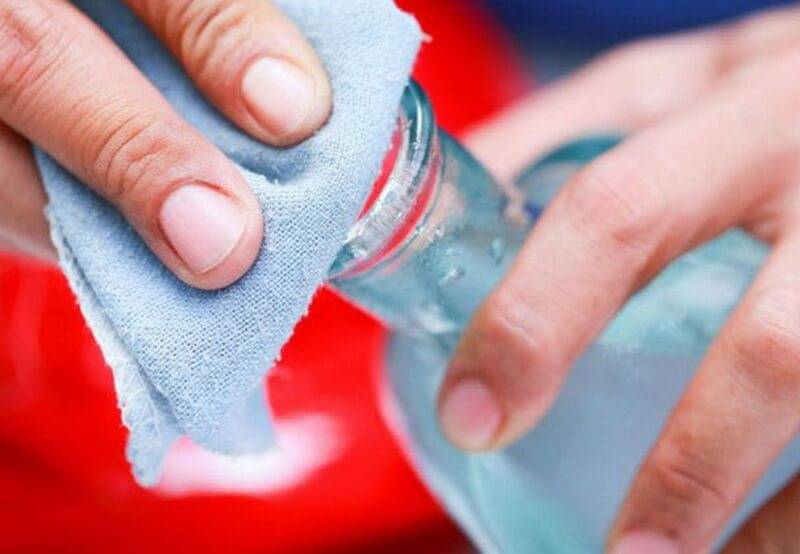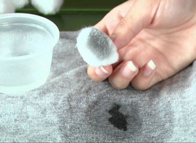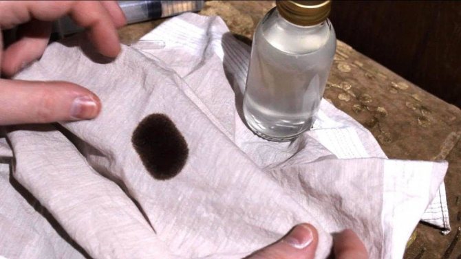 - Спиртом. Загрязненный участок смачивается этиловым составом и локально застирывается. При необходимости процедура проводится несколько раз.