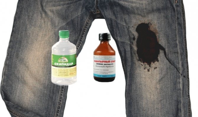 Эффективно выводит жирные пятна скипидар в соединении с аммиаком в равных долях. Раствор наносится тампоном на грязное место и удерживается на материи до 3 часов. Затем рекомендуется обычная стирка.