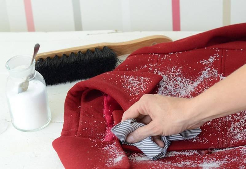 - Уксусом с горчичным порошком и солью. Компоненты в равных пропорциях смешиваются, растворяются в небольшом количестве воды и наносятся на жирный развод. Удерживается состав на ткани 20 минут, после чего вещь стирается.