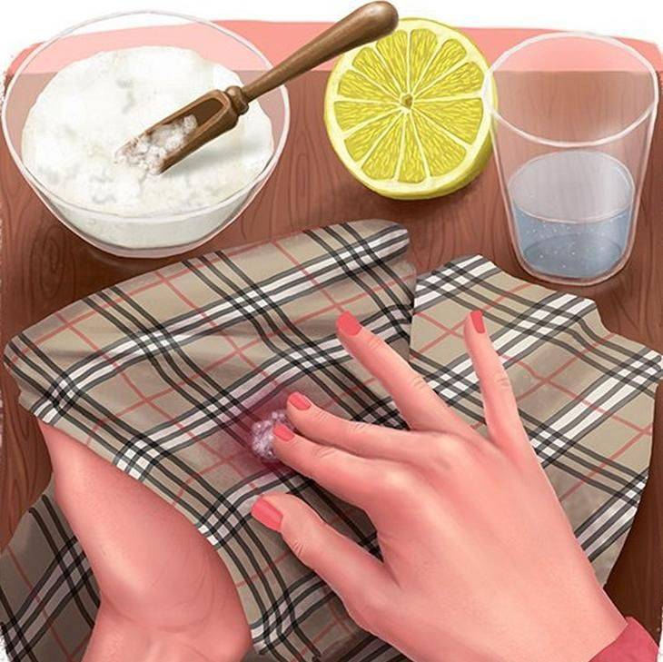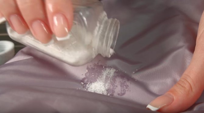 Хорошо расщепляет жир смесь соли с содой в пропорции 1:1. Состав наносится на грязное смоченное водой место на 30–60 минут, затем материя тщательно стирается хозяйственным мылом.