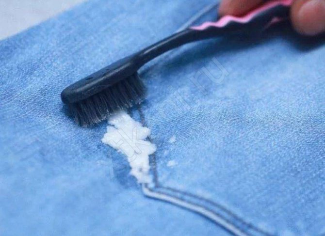 - Зубным порошком. Он насыпается на грязное место и слегка втирается. После насыщения жиром порошок убирается, а другой наносится. Процесс чистки выполняется несколько раз до тех пор, пока не произойдет удаление маслянистого следа.