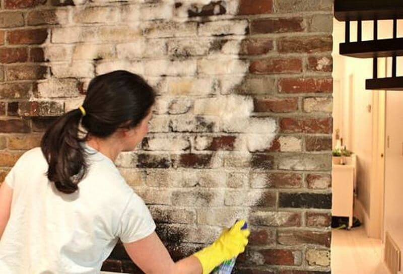 Для удаления сажи с кирпича лучше всего подходит обычный столовый уксус. Перед обработкой обязательно проведите сухую чистку. Предварительно смешайте уксус с водой в равных пропорциях. Обильно нанесите жидкость на поверхность, и тщательно ототрите загрязнения щеткой.