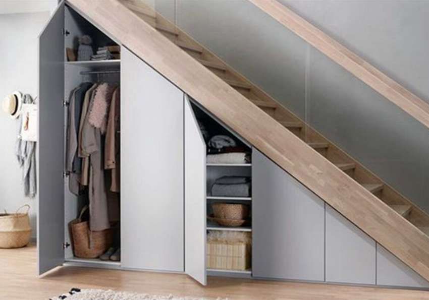 В небольшой прихожей или комнате на даче выгоднее всего будет разместить шкаф-купе под лестницей. Сдвигающиеся в сторону панели, служащие ему дверями, позволят не загромождать проход во время поиска нужных вещей.