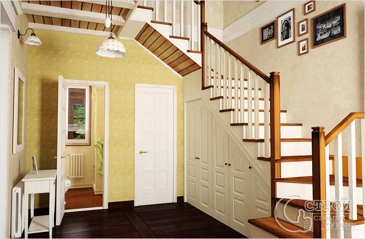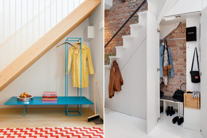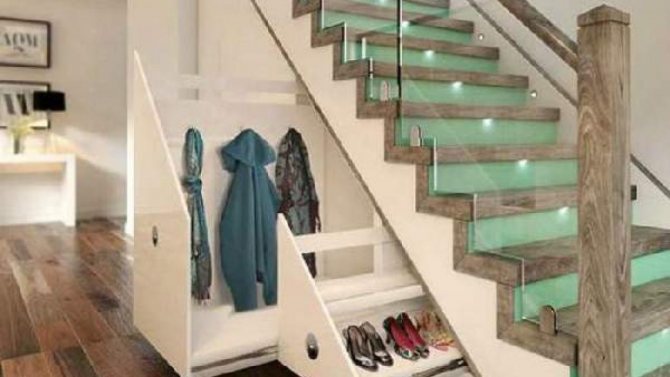 Очень удобно использовать пространство под лестницей как часть прихожей. Место для хранения вещей может быть в верхней высокой части лестницы- в шкафу с зеркальной дверцей.Или можно использовать весь лестничный проем — высокие шкафы для верхней одежды, низкие — для обуви.Не обязательно всю верхнюю одежду прятать в шкафы. Под лестницей легко можно обустроить открытую вешалку для одежды и разместить полки для обуви.