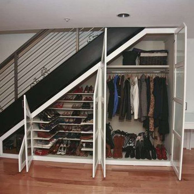Гардероб под лестницей. Если лестница в доме находиться в комнате, то в пространстве под ней можно устроить гардероб. Это могут быть простые открытые системы хранения — с рейлингами для одежды и секционными ящиками. Или можно обустроить настоящую гардеробную комнату с тыльной стороны лестничного проема. Такой вариант хранения вещей — мечта каждой хозяйки. Если расположение лестницы не позволяет сделать вход, то традиционный вариант со встроенными шкафами под лестницей, также вполне практичен.