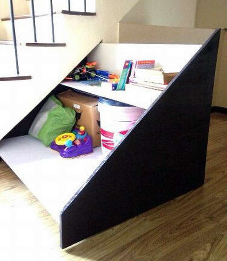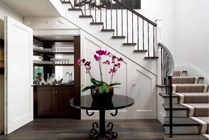Место для хранения домашних заготовок. Опять же, если в вашем доме нет подвала, его можно сделать под лестницей. Тогда стоит предусмотреть какие-то двери, чтобы скрыть все ваши съестные сокровища. Но это очень удобное решение, ведь вам не придется выходить из дому каждый раз, когда потребуется очередной продукт.