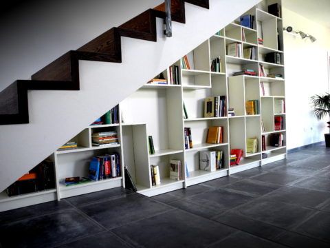 Эта зона отлично подходит для шкафа под книги — в зависимости от её размеров там может поместиться целая библиотека. Это будет стильно смотреться и впишется практически в любой дизайн. Высота полок в таком шкафу соответствует размерам ступени, а их количество — количеству ступеней, но, можно придумать и другую схему. На первый план выходит дизайн как конструкции, так и помещения в целом, потому что конструкция такого шкафа достаточно примитивна, чтобы собрать его своими руками буквально за несколько часов.