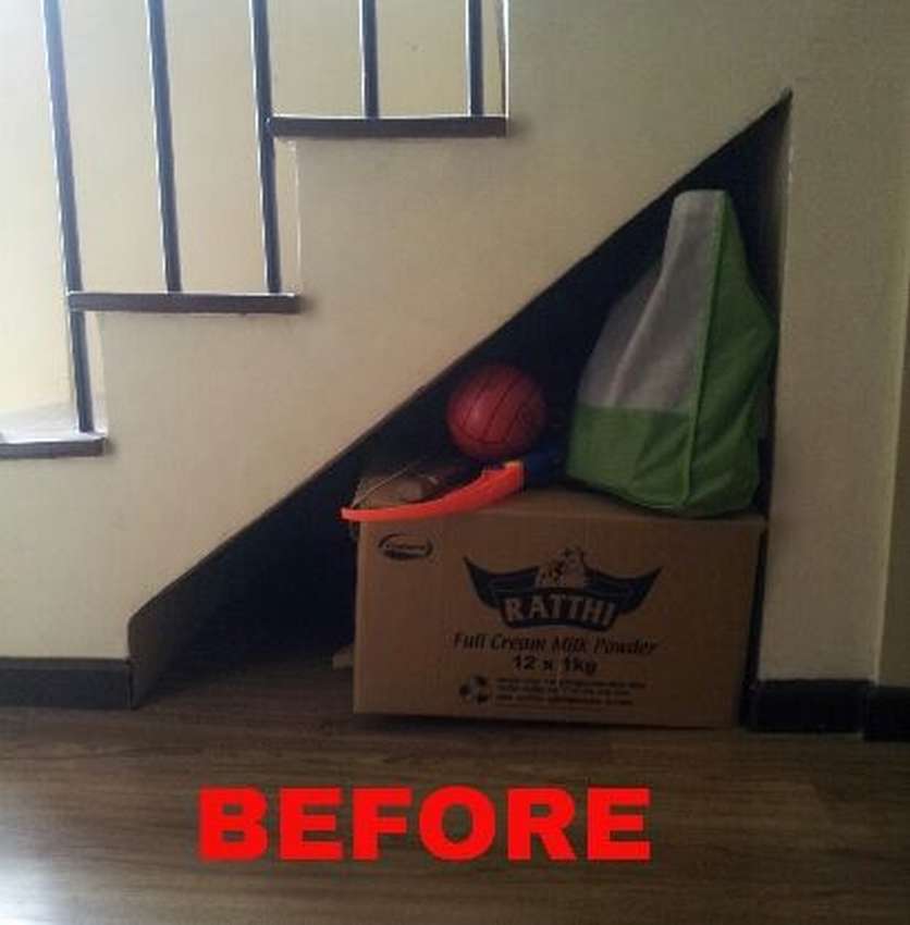 Перед тем, как приступать к каким-либо монтажным работам, необходимо очистить пространство под лестницей от хлама. Следует провести генеральную уборку, очистить все поверхности. Если есть перегородка, ее желательно предварительно разобрать, чтобы немного разгрузить захламленное помещение.