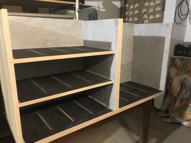 Внутреннее покрытие лучше украсить до установки полок. Можно использовать обычную деревянную вагонку.