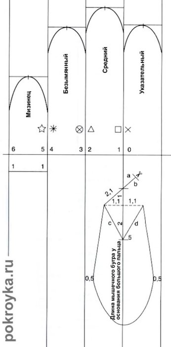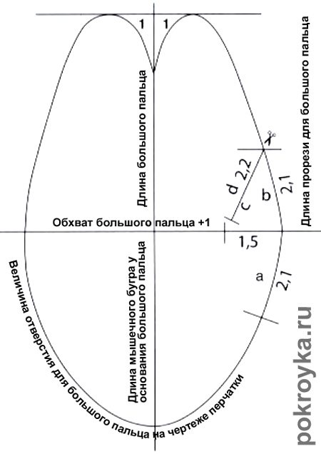 Для того чтобы выкройка перчаток была предельно комфортна, необходимо правильно построить выкройку для большого пальца. Делается она так: