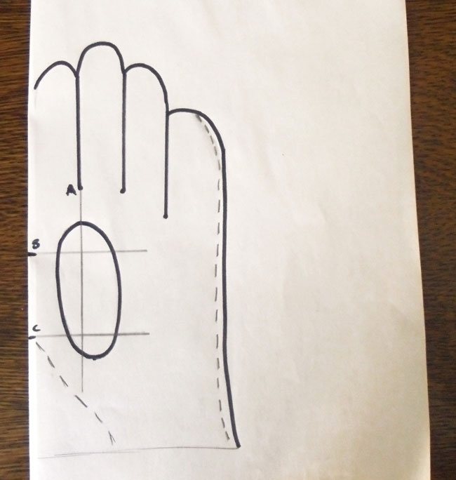 Отметьте точками B и C место, где к руке подходит большой палец. Проведите вертикальную линию от A (это точка наверху промежутка между указательным и средним пальцами) и горизонтальные линии по B и C. Нарисуйте овал отверстия для большого пальца.