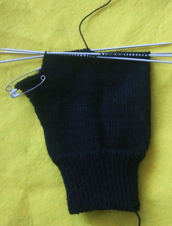 - Связать 10 рядов по кругу и снять на вспомогательную спицу 9 петель с противоположной стороны для формирования указательного пальца. Снять еще 9 петель со следующей спицы.