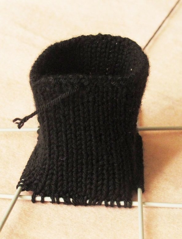 - Продолжить работу по кругу и провязать 10 рядов. Переместить крайние 9 петель на вспомогательную спицу – это будет мизинец.