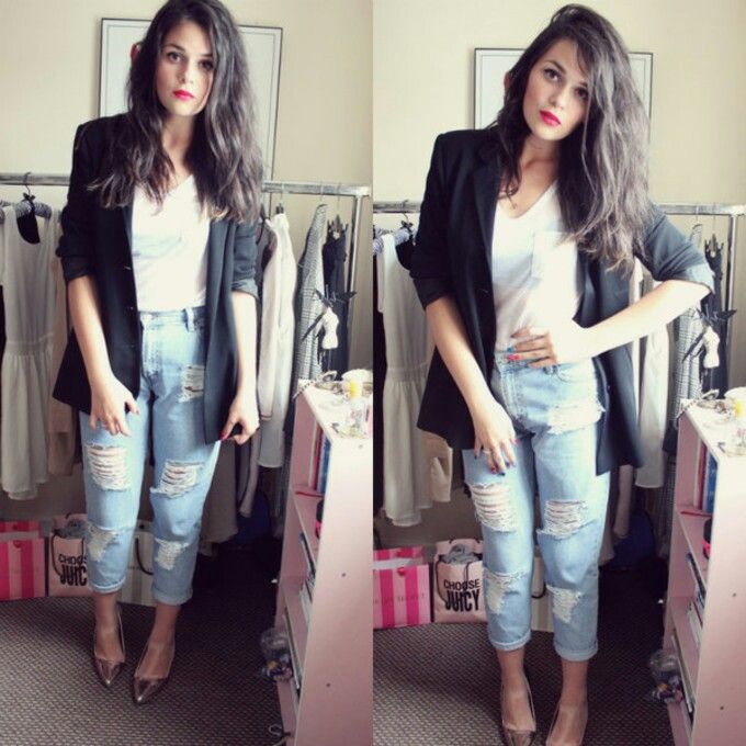 Мода сегодняшнего дня позволяет идеально сочетать строгий и спортивный стиль в одном. Это как раз и можно сказать о джинсах бананах и классических пиджаках. Будет еще более стильным, если джинсы будут порваны или с неровным краем.