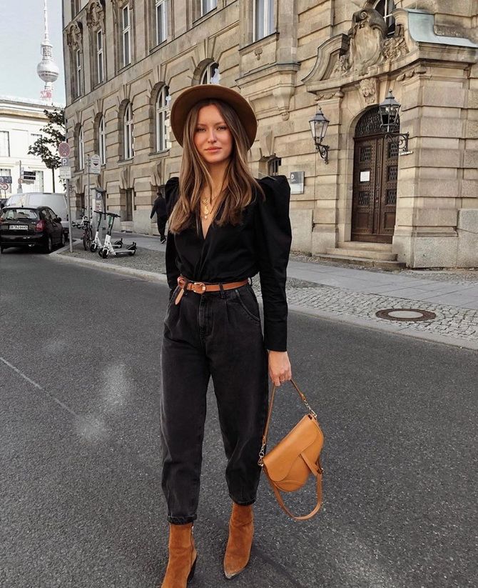 - Классические штаны — отличаются умеренным объемом в области бедер. Длина доходит до лодыжек. Крой максимально простой, без декора, поэтому несложно определить, с чем носят брюки «бананы» в классическом исполнении. Если это образ для офиса, то выбирают блузу, водолазку.