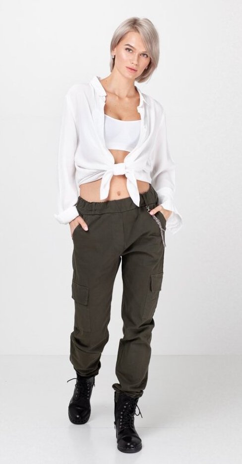 У белых брюк есть два недостатка – они добавляют объем фигуре и требуют частых стирок. Если же фигура в полном порядке и проблем с уходом за одеждой нет, то купить штаны-бананы в белом цвете стоит. Эта вещь станет основой для различных летних и клубных луков. С белыми штанами можно комбинировать практически любые кофты и рубашки, футболки и куртки.