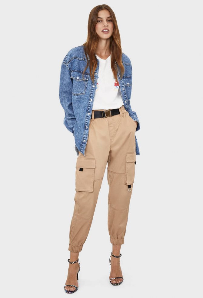 - Модель с накладными карманами — альтернатива привычным врезным карманам. Такие изделия популярны среди молодежи, предпочитающей стиль стрит-стайл. Их можно сочетать даже с туфлями на шпильке.