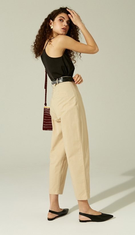- «Бананы» с высокой талией — популярны не меньше, чем аналогичного кроя юбки. Пояс играет роль корсета, который идеально «спрячет» слегка выступающий живот и сделает талию намного четче. Крой может быть как свободным, так и немного облегающим.